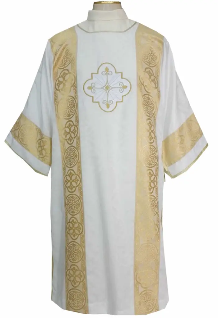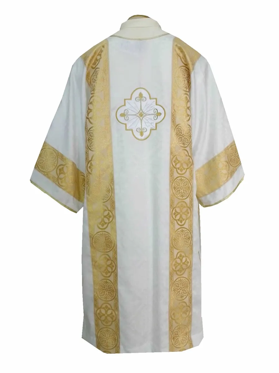 Dalmática na cor Branca, com galões litúrgicos Dourados frente e costa e mangas, com detalhes do Símbolo em Bordados. Confeccionada em tecido litúrgico, o que garante um toque de nobreza e elegância.