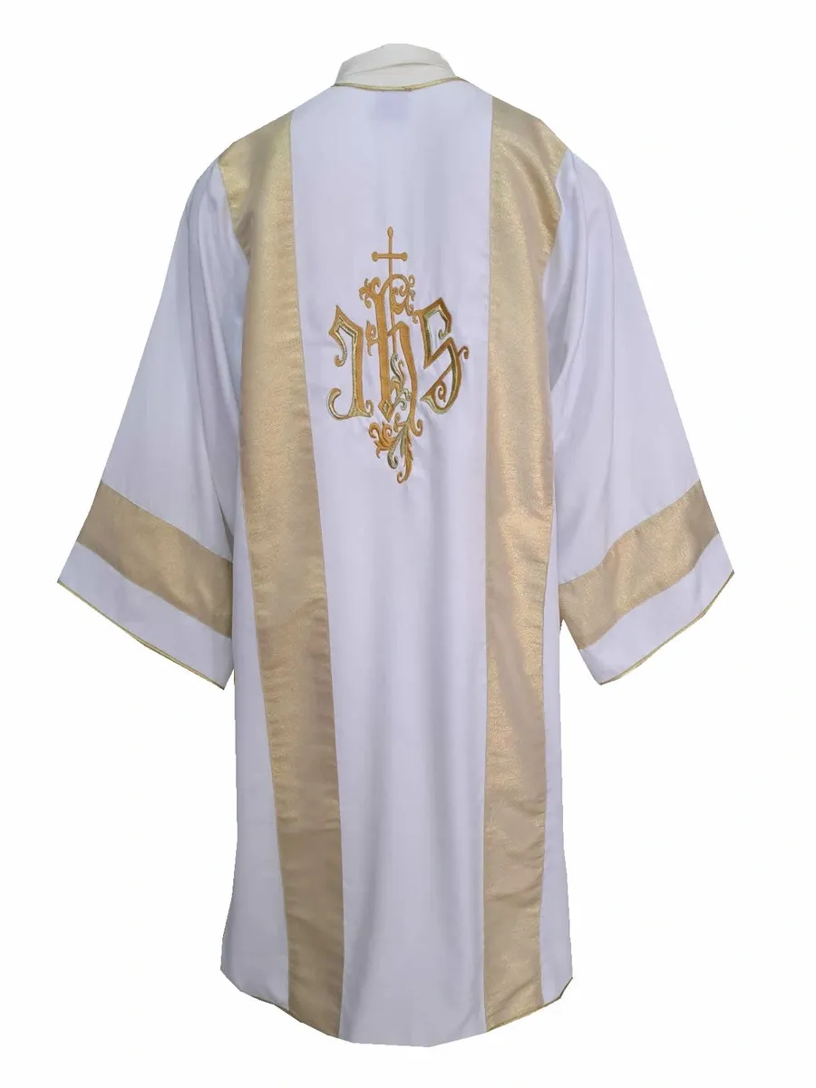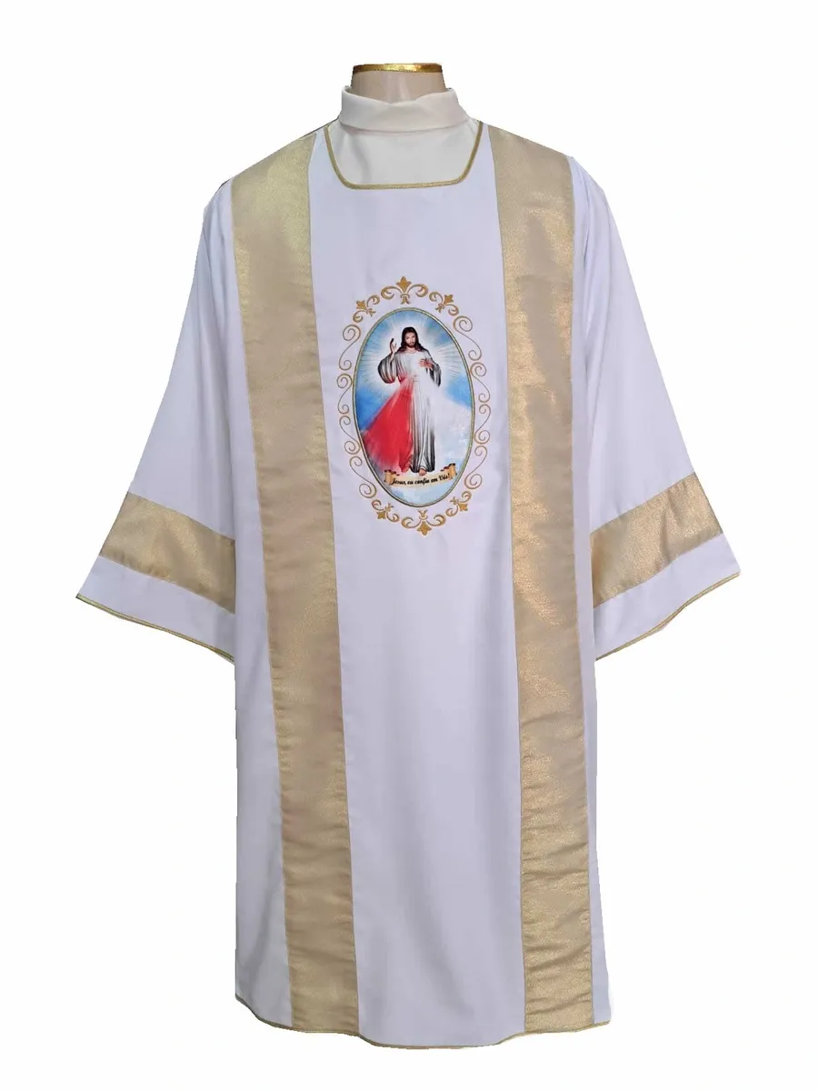 Dalmática na cor Branca, com imagem do Jesus Misericordioso aplicada, Galões em tecido Litúrgico Dourado, e acabamentos em Bordados. Confeccionada em City Strech.