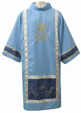 Essa Dalmática Mariana Azul é uma peça belíssima, com aplicação de galões e ricos detalhes em bordado. Ela é confeccionada em um tecido leve, frio e de ótimo caimento, garantindo conforto e um visual impecável.