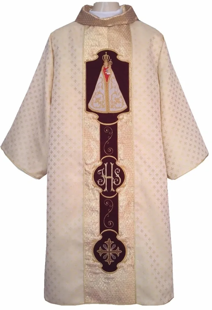 Essa Dalmática dourada é uma peça belíssima, com a imagem de Nossa Senhora de Nazaré aplicada, e detalhes em tecido aveludado com bordados. É confeccionada em tecido litúrgico, garantindo a qualidade e o caimento ideal.