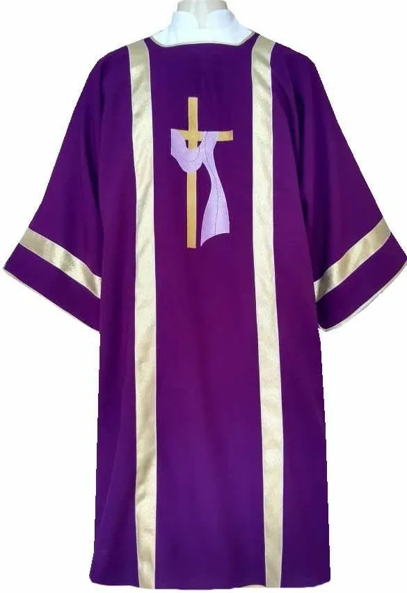 Essa Dalmática Roxa é uma peça elegante, com galões dourados e bordados na frente e nas costas. Ela é confeccionada em um tecido leve, frio e de ótimo caimento, o que garante conforto e um visual impecável.