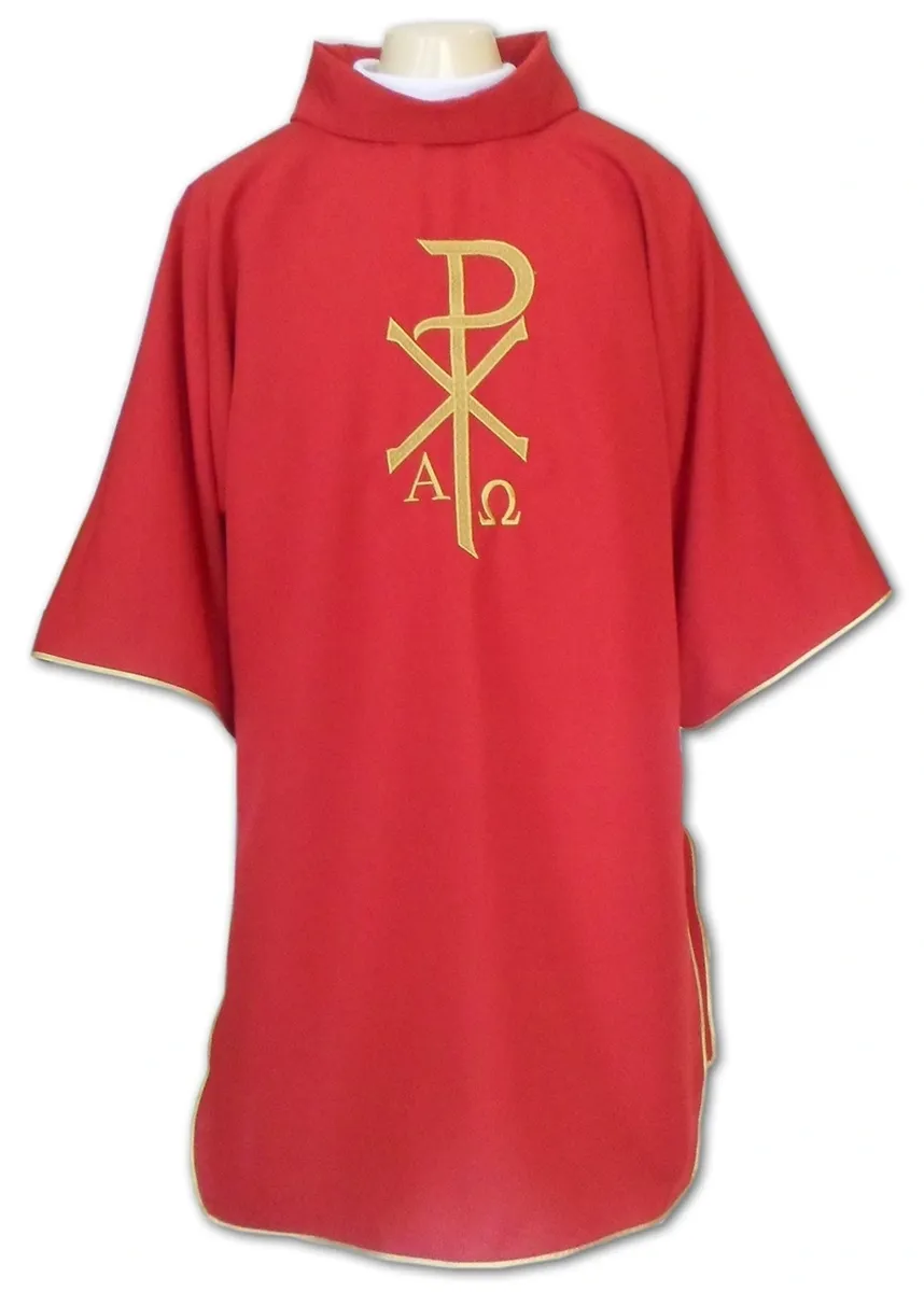 Essa Dalmática Vermelha Bordada é uma peça completa, pois acompanha uma Estola Diaconal. É confeccionada em tecido Oxford, que garante boa durabilidade.